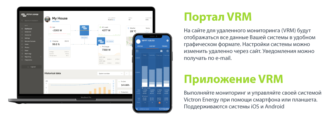 Удаленный мониторинг и контроль Осуществляйте мониторинг и управление системой Victron локально (LAN) или удаленно через Интернет из любой точки мира при помощи бесплатного приложения VRM и бесплатного онлайн-портала VRM. Ко всем сохраненным и текущим данным доступ возможен с помощью телефона, планшета, ноутбука или ПК, работающих на различных операционных системах. С помощью Cerbo GX и панели управления GX Touch возможно осуществить любые настройки как инвертора так и всей системы Victron. |