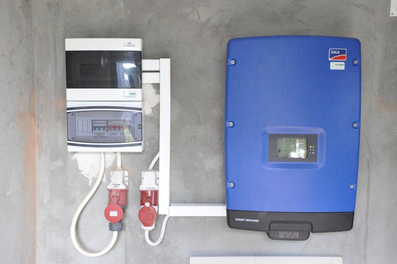 Сонячна установка потужністю 10 кВт, була розбита на два геліополя. Дахова частина вмістила 24 фотомодуля + наземна на 16 модулів. Були використані сонячні батареї LDK і мережевий інвертор SMA.