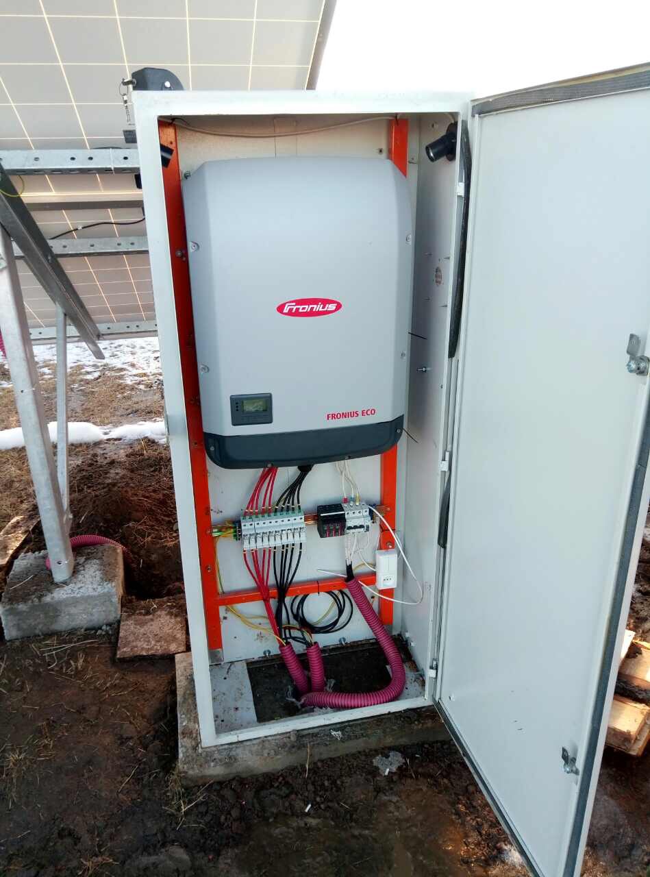 Також варто сказати що при максимально можливій для фізичних осіб потужності сонячної електростанції в 30 кВт, клієнт зупинив свій вибір на мережевому інверторі Fronius Eco 27.0-3-S, потужністю 27 кВт із завищеною встановленою PV потужністю 28,6 кВт. З огляду на більш прості технічні характеристики і високу потужність інвертора ми змогли досягти економії на перетворюючому обладнанні майже в 45%. Таке рішення вдалося реалізувати завдяки можливості розташувати всі модулі в однакових умовах (орієнтація, кут нахилу) і відповідно використовувати інвертор c одним MPP трекером. При цьому продуктивність електростанції залишається такою ж як і при використанні інверторів Fronius серії SYMO.