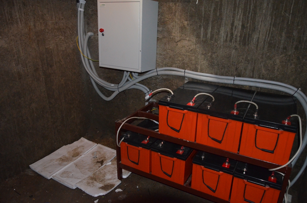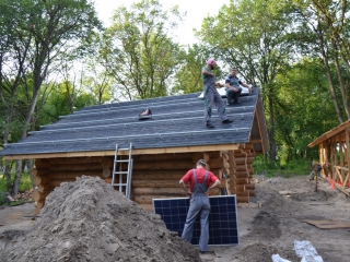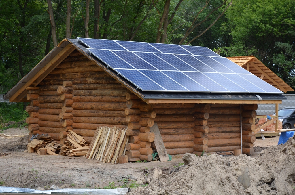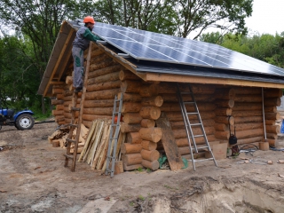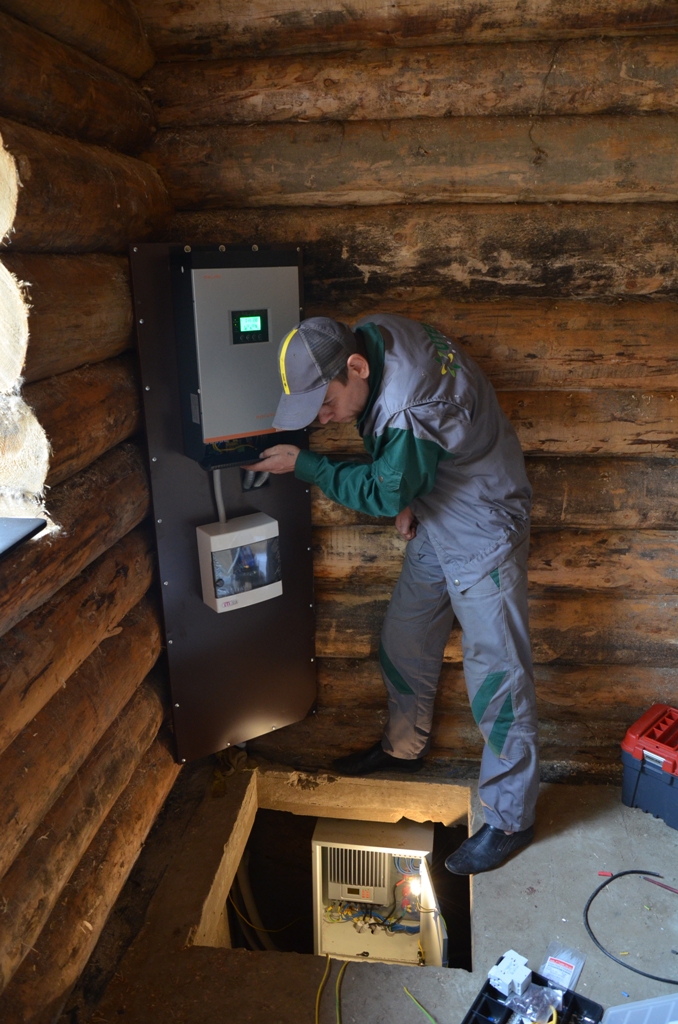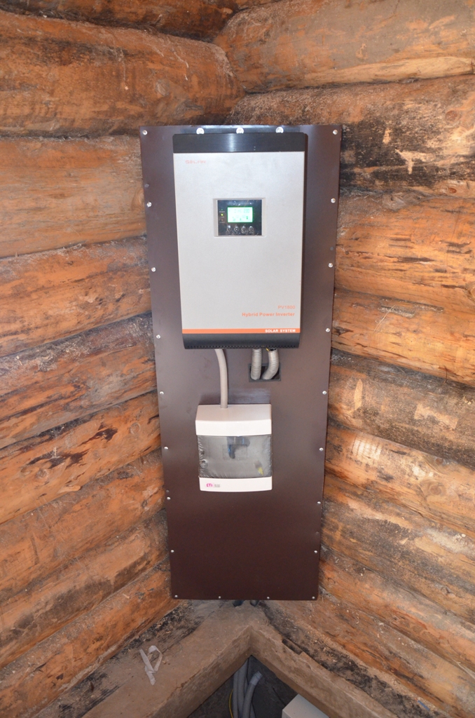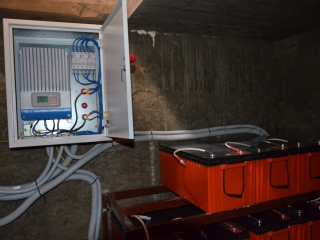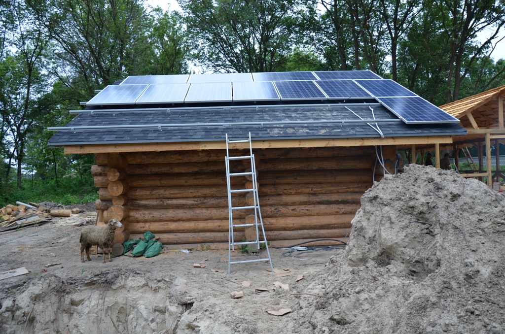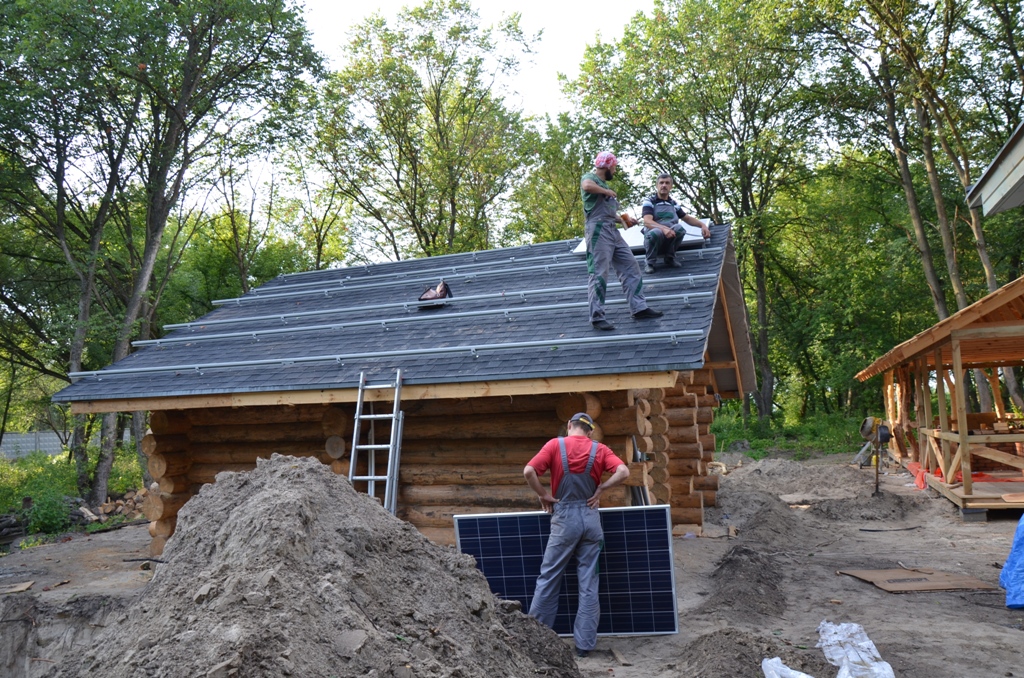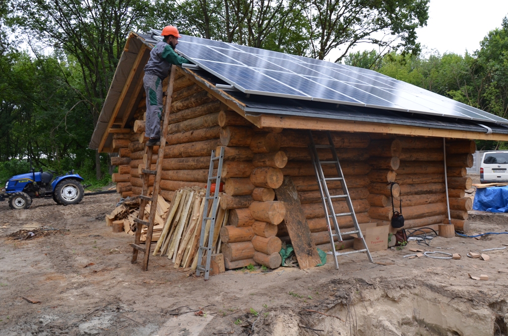 Повністю автономна акумуляторна система харчування для затишного банного комплексу розташованого на плавнях річки Дніпро в Черкаській області. Завдання полягало в монтажі, запуск та налаштування потрібного режиму роботи автономної системи. На даному об'єкті замовник захотів застосувати самостійно куплене обладнання, так що у нас була відмінна можливість спробувати попрацювати з китайським виробником перетворювати обладнання, що виходить у наших фахівців вкрай рідко. Проте ми впоралися: сонячні батареї змонтували, інвертор запустили, правильну роботу налаштували. Гофротруба в підвалі буде додатково закріплена після закінчення будівельних робіт. Стелажі під інвертор і акумулятори виготовлені самостійно компанією UTEM SOLAR. Монтаж проходив при дійсно аномальної спеки, коли в тіні градусник показував 35-37 ° C, а на даху температура перевищувала позначку в 40 ° C.