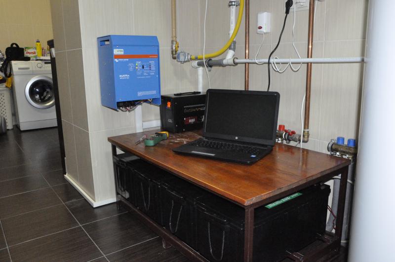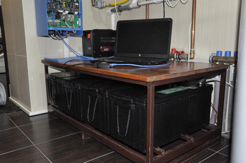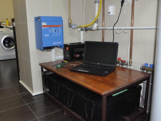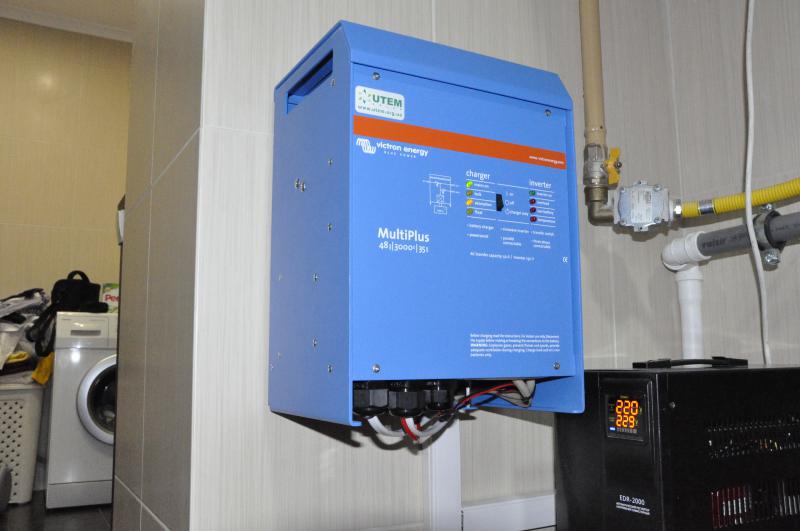 Система безперебійного електропостачання для виділеної групи навантажень потужністю 2,5 кВт на базі автономного інвертора Victron MultiPlus 48/3000. На вимогу клієнта була проведена комутація виділеної групи навантажень в одну фазу, а також оновлено програмне забезпечення інвертора для максимально швидкого перемикання з живлення від мережі на харчування від акумуляторних батарей. Стелаж ізгтотовлен компанією UTEM SOLAR спеціально для даного маcсіва акумуляторів.