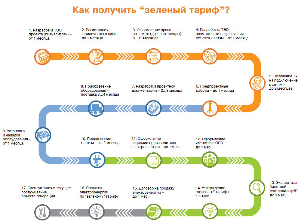 Згідно Закону України "Про Електроенергетику", суб'єкти господарської діяльності, які виробляють електроенергію з використанням відновлюваних джерел енергії можуть її продавати державі за підвищеним тарифом. Дана норма закону діє до 2030 року і зобов'язує державу в особі державної компанії "Енергоринок" купувати у суб'єктів всю вироблену відновлювальними джерелами електроенергію за зеленим тарифом. Всі тарифи прикріплені до валюти Євро і щокварталу перераховуються згідно середнього курсу НБУ за попередній місяць.