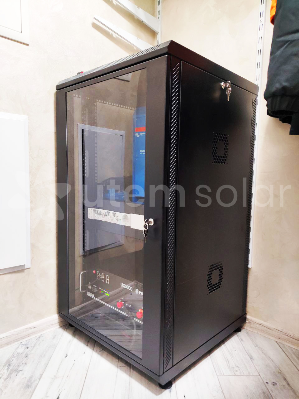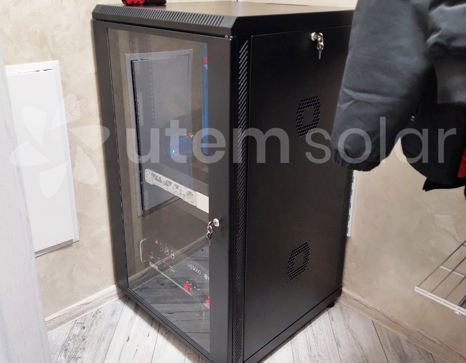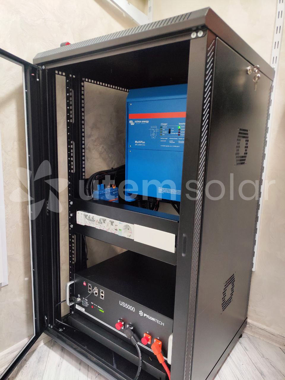 Система побудована на висококласному автономному інверторі серії MultiPlus від компанії Victron Energy (Нідерланди). Цей пристрій має вбудований 4-х стадійний зарядний пристрій з максимальним зарядним струмом 30 А, високошвидкісне 16-ти амперне трансферне реле передачі. Батарейний масив складається за літій-іонних акумуляторів від компанії Pylontech. Також на замовлення клієнта може бути виготовлений стелаж для компактного розміщення комплекту обладнання.
